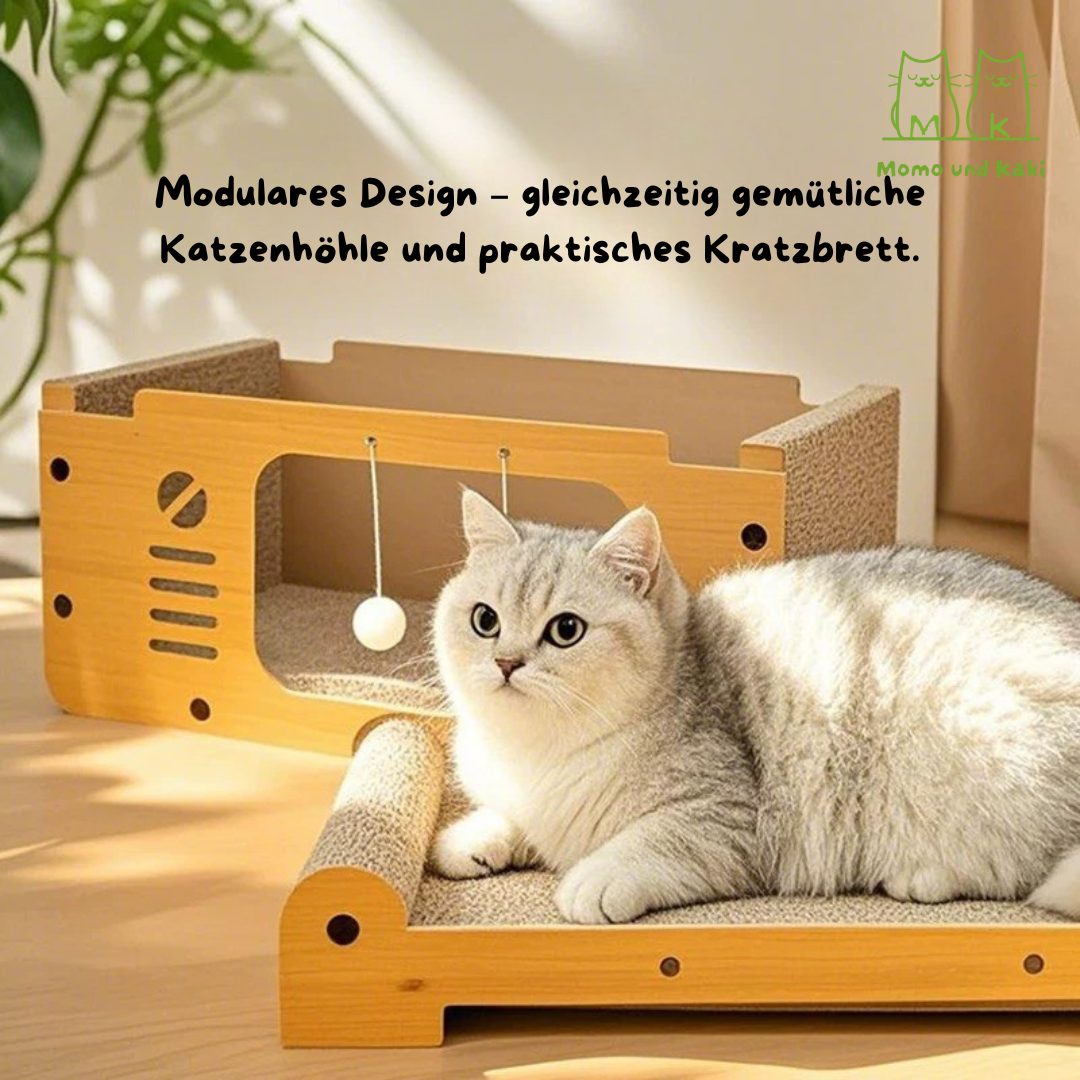 Krallen wetzen, spielen und entspannen – alles in einem. Dieses Kratzbrett-Katzenhaus kombiniert eine großzügige Kratzfläche mit einem gemütlichen Rückzugsraum und passt dank minimalistischem Design in jedes Zuhause.